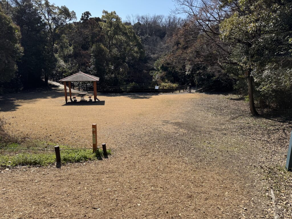 開けている芝生の広場で東屋がある。準備運動やストレッチも行える。